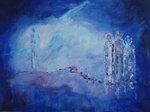 2009Een figuur staande voor een lange weg. Geschilderd in de kleur blauw, gemengde techniek. blauw wit rood paars