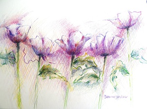 2023Paarse bloemen deze zijn met aquarelpotlood gemaakt. Hiervan kunnen kaarten gemaakt worden.